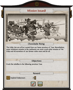 From time to time missions are issued, either by your clan, the Shogun or, if appropriate, your European trade partners. Mission objectives may be reviewed from the objectives list beneath the radar map or from the summary tab on the clan management panel. Although there is no penalty for failure, successful completion of a mission results in a reward, often in the form of bonus effects for your clan. If a mission becomes unachievable due to factors outside your control it will be cancelled automatically.